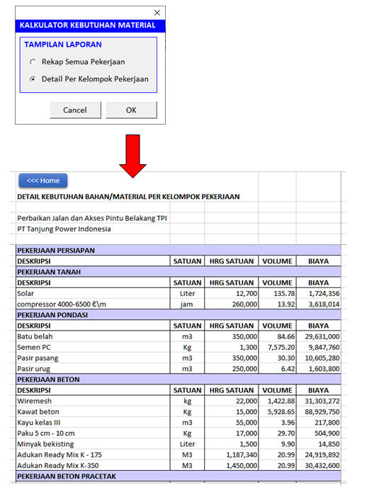 Anda bisa memilih untuk menampilkan rekap rincian seluruh upah / material dalam 1 proyek, atau bisa juga ditampilkan per kelompok pekerjaan.